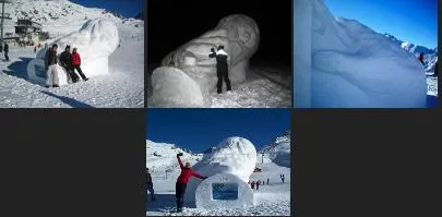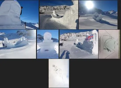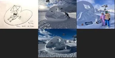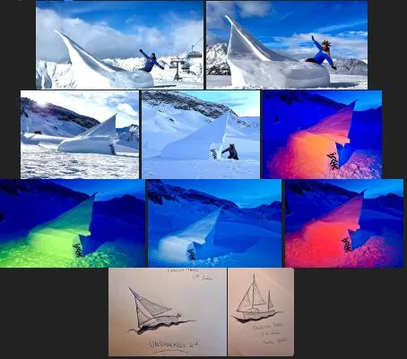 Martin Sharp and Justin Scott, create a giant snow sculpture in the shape of a sailing boat named "Unsinkable 2. Creating the design for the 29th international snow sculpture competition, Shapes in White, in Silvretta Arena, Ischgl, Austria